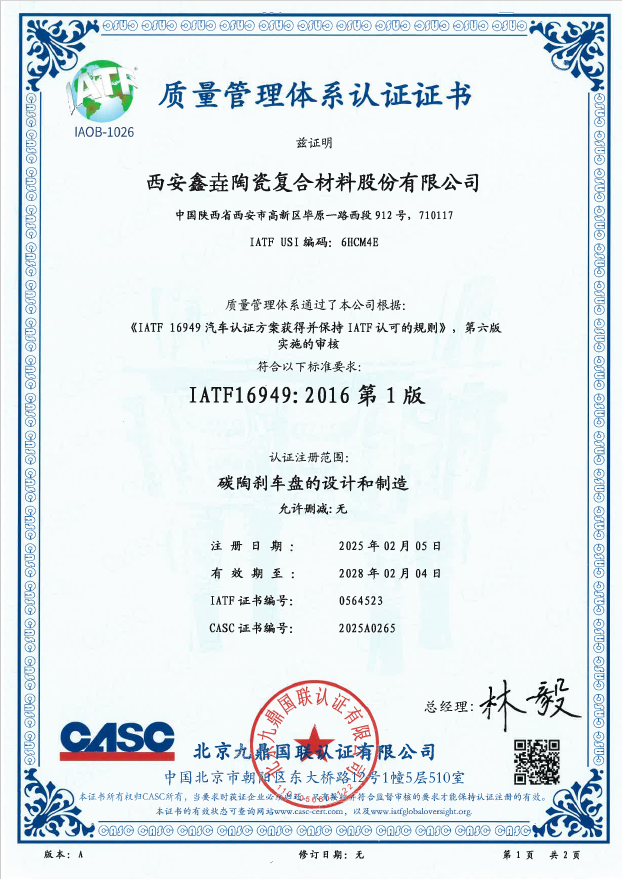 近日,西安鑫垚陶瓷復(fù)合材料股份有限公司收到了北京九鼎國聯(lián)認證有限公司下發(fā)的IATF 16949汽車質(zhì)量管理體系認證證書,認證注冊范圍為“碳陶...